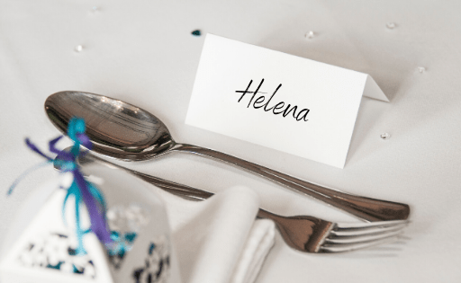 O place card deve ser sempre posicionado em frente ao prato, pois assim o convidado encontrará facilmente o lugar a ele designado.