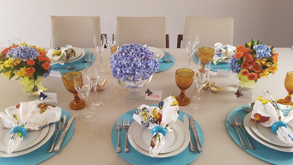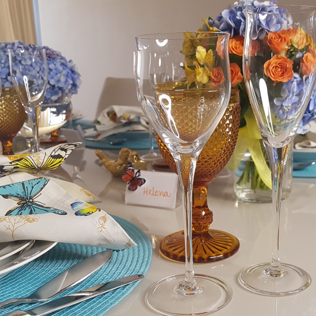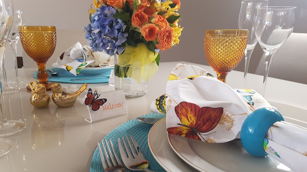 A harmonia de cores escolhida foi azul + laranja e amarelo. Guardanapos de algodão estampados de borboletas, com argolas de resina azul turquesa, alegram a mesa. Para água, taças de vidro texturizado, para o vinho e espumante, taças de cristal transparentes. Um toque gracioso na decoração e um mimo para os convidados, place card com borboletas, seguindo a estampa dos guardanapos.