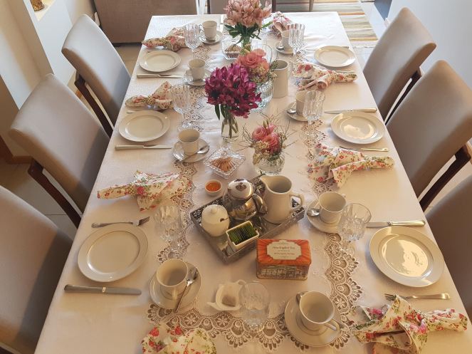 Aqui fiz uma composição alegre e descontraída usando jogos americanos estampados e guardanapos de tecido. Pratinhos e talheres de sobremesa para degustar as delícias que preparei para uma noite de bate papo informal com amigos queridos. Espumante, bons vinhos, bom papo e uma noite memorável!E para um encontrinho de amigas, essa mesa de chá/café foi a estrela da tarde. Para mesas de chá a melhor opção é sempre usar uma toalha, além de ficar mais elegante acomoda melhor todos os itens da mesa. Aqui optei por guardanapos com estampa floral delicada e jarros com alstroemerias (ou astromélias) flores cujo significado é amizade eterna e felicidade plena.