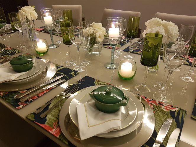 Aqui usei uma linda toalha de algodão com estampa floral, sousplat verde limão, louça branca e panelinhas para servir um risoto. Uma outra composição com taça verde para água e cristal transparente para vinho. Para decorar a mesa, um vaso com astromélias e folhas naturais e velas para criar um clima mais aconchegante.