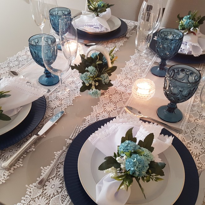 Ah o azul que eu tanto gosto! Para um jantar intimista, uma mesinha cheia de encanto! Nesta composição usei um trilho branco com renda guipir, guardanapos de linho e sousplat azul marinho para contrastar. Os porta guardanapos com hortênsias foram feitos por mim. Para decorar optei por velas e uma mini cestinha com hortênsias.