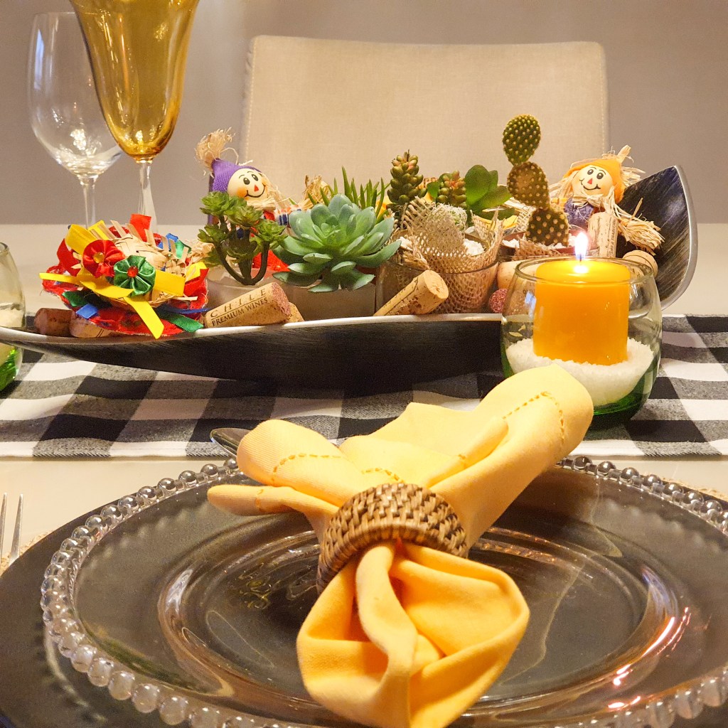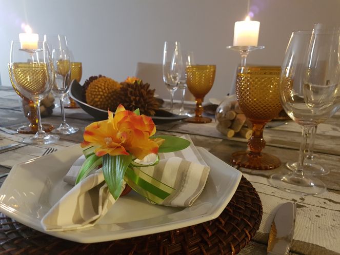 Aqui uma composição rústica com toalha de mesa em estampa imitando madeira de demolição e sousplat de ratan. Taças bico de jaca, na cor âmbar para água e cristal transparente para vinho tinto e espumante. Guardanapo em algodão listrado, com porta guardanapos de flor laranja para dar um contraste. Para o centro de mesa usei uma barca com bolas de sementes do cerrado.