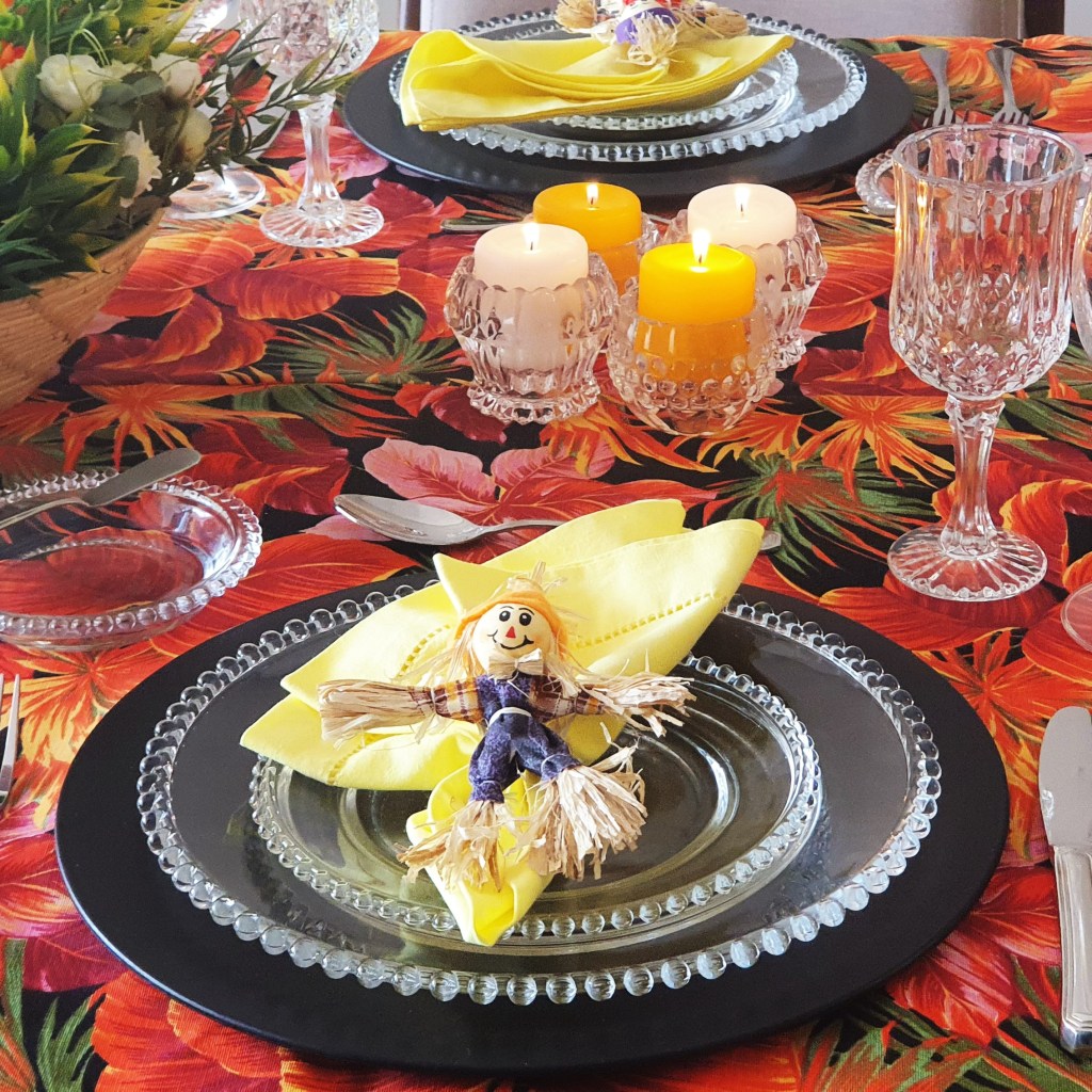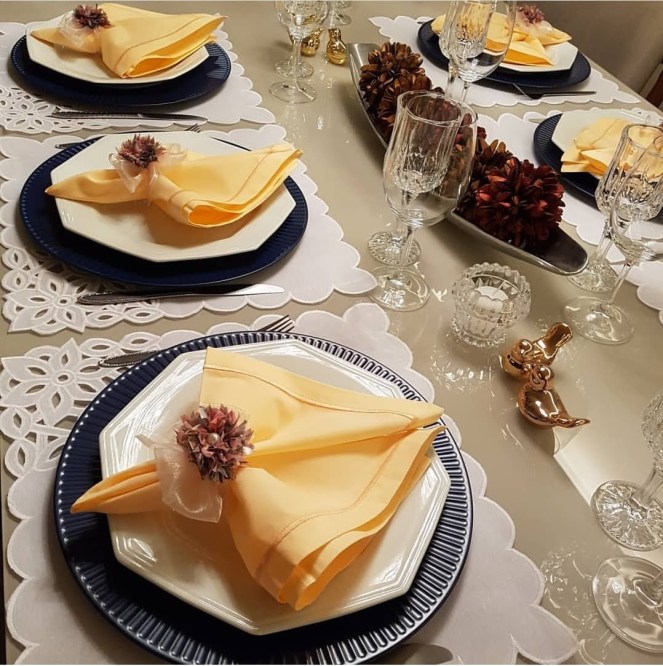 Sim, amo muito tudo isso e amei preparar essa mesa usando jogos americanos quadrados, de linho com bordado richelieu. O azul marinho do sousplat fez a diferança na composição com pratos em porcelana branca, guardanapos amarelos e porta guardanapos feitos por mim, com flores de seda, miolo de pérola e laço de fita de seda furtacor. Para o centro de mesa usei uma barca com sementes do cerrado e passarinhos dourados, símbolizando afeto e união.