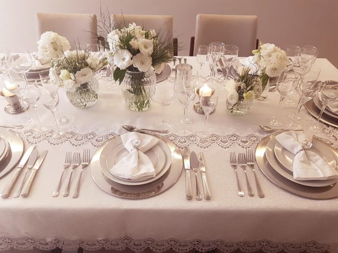 Para um jantar mais formal preparei esta composição usando toalha de linho branco com bordado em richelieu, sousplat em inox e pratos em porcelana branca com filete dourado. Taças em cristal para água, vinho tinto, vinho branco e espumante. Guardanapos em linho branco com porta guardanapos de pedra solitária. Para o centro de mesa vasos com lisianthus naturais e castiçais com velas.