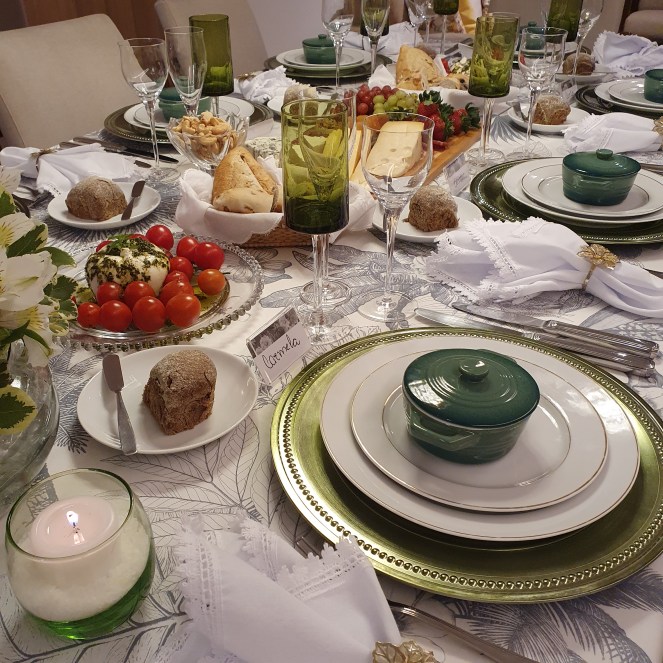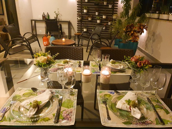 E para reunir amigos, uma boa tábua de frios, cesta de pães, pastinhas, chutney e picanha na brasa fatiada. Hummm, essa foi uma noite memorável! Nesta mesa fiz um mix de estilos, usando toalha com estampa imitando madeira de demolição, talheres com cabos de madeira próprios para churrasco, com sousplat, pratos e guardanapos brancos e porta guardanapos com flores, feitos por mim. Uma mesa elegante e cheia de charme, com toalha branca e pratos estampados. Para o centro de mesa, flores naturais e castiçais baixos com velas. O guardanapo verde e as taças em cristal transparente completaram esta composição que eu amei preparar.