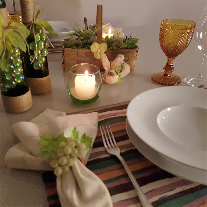 Ahhh que delícia receber amigos, não é mesmo? Nesta composição usei jogos americanos de algodão estampando com uvas e hortênsias. Para valorizar a estampa optei por pratos e taças transparentes, guardanapos de linho branco e porta guardanapo com um cachinho de uva. Para o centro de mesa, velas brancas em vidros com laços de cordão de juta e vasinhos com flores permanentes.