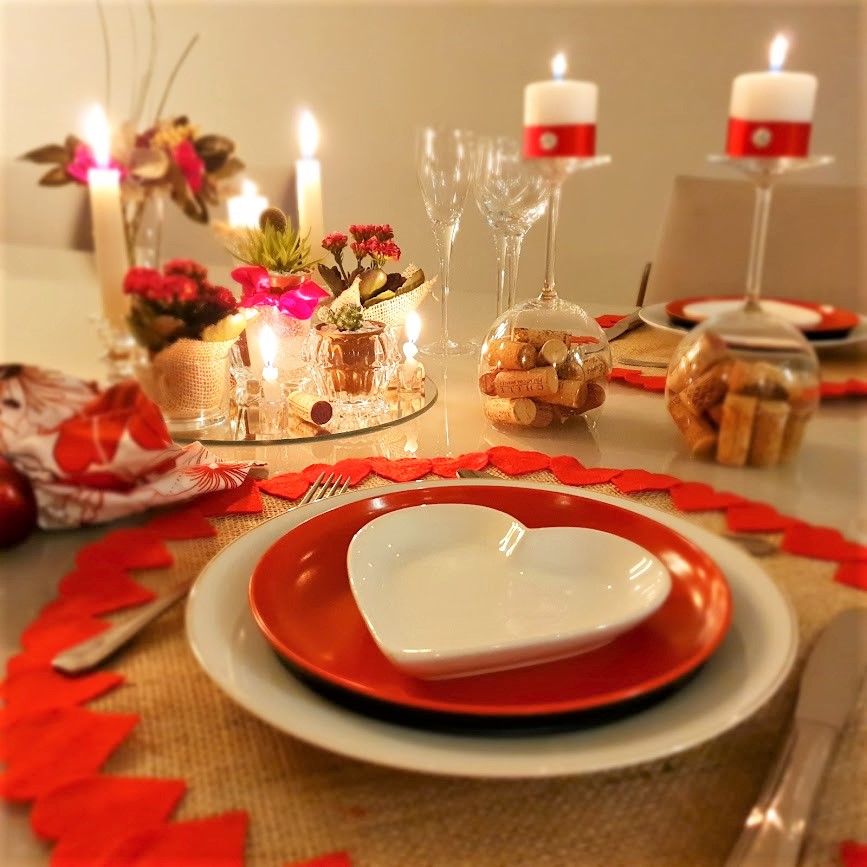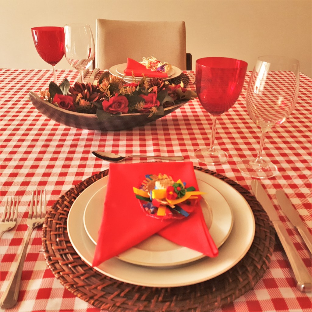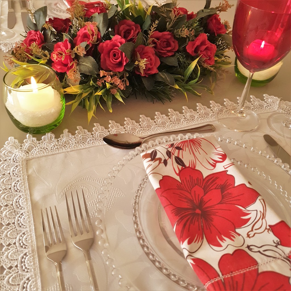 Mesinha para dois, adoro!! Aqui usei um trilho de linho em richelieu, sousplat em inox e pratos em porcelana branca. Taça vermelha para água e cristal transparente para vinho tinto e espumante. Guardanapos em algodão estampado, com argola vermelha. Para o centro de mesa um vasinho com mini rosas vermelhas naturais e pequenos castiçais com velas.