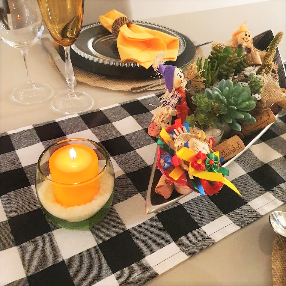 Mesinha no terraço para recebr amigos! Desta vez optei por jogos americanos com listras em tons terrosos e mini tábuas para servir os petiscos de entrada. O guardanapo de linho foi encaixado na ponta da tábua para diferenciar da forma tradicional. Para o centro de mesa usei um trio de velas colocadas em vidros com sal grosso e arranjos com flores naturais, predominando as alstroemerias (ou astromélias) cujo significado está fortemente relacionado à amizade e aos vínculos afetivos.Mesinha pra dois, usando com trilhos com estampa em tons terrosos, sousplat de ratan. guardanapo de linho e porta guardanapo floral.